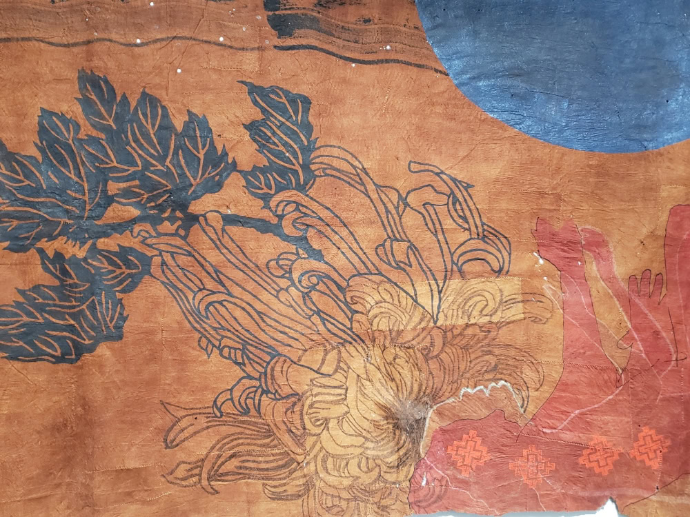 Craftspeople peel the bark from the tree, then soak it and beat it with mallets for weeks. Hinton bought six blankets and started to paint on them, but then stopped when she learned the cloth was used for shrouds and other ceremonial purposes. She held onto them, figuring she would gift them back eventually. But reaching out to do this, she encountered Elders who encouraged her to paint on them.