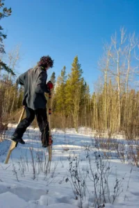 I’m walking into the woods, dragging a pair of hand-held stilts behind me. Normally I use the pair of stilts that strap onto your lower leg and have platforms with shoes attached to them. However, for this endeavour, I will use hand-held stilts, mostly because if I start falling I can easily jump out of them, whereas with the other pair all you can do is pray for a soft landing.