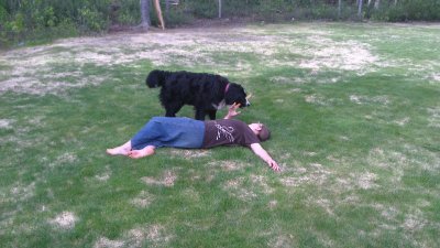 I’ll race our dog to the lawn and run around, playing fetch with her. The only way to get the stick from her is by playing dead or giving her a doggie treat.